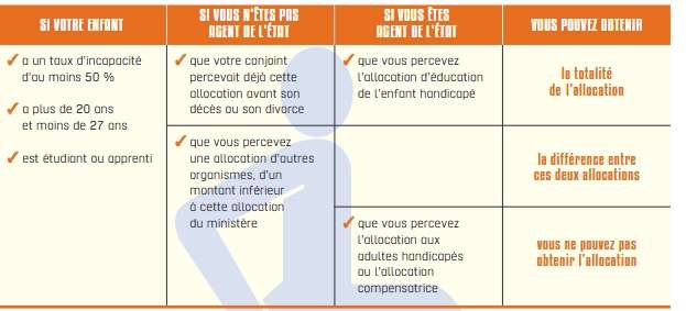 Aucune condition de ressources ou d’indice n’est requise mais cette prestation n’est pas cumulable avec l’allocation d’adulte handicapé (AAH).